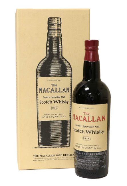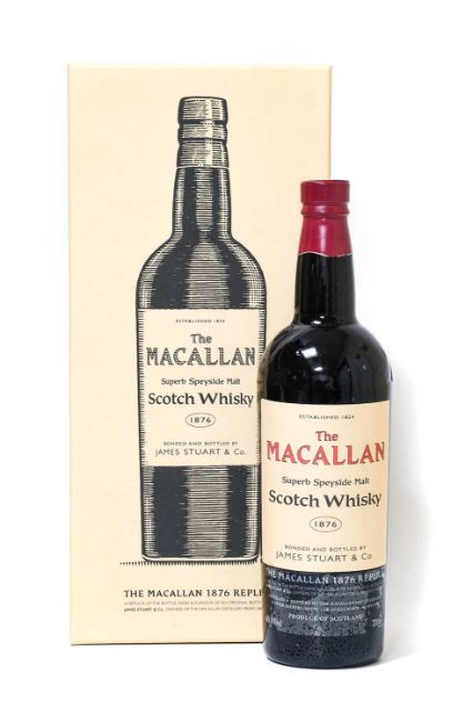 The Macallan 1876 Replica bearing a copy of the original label ''The Macallan Superb Speyside Malt Scotch Whisky, 1876, Bonded and Bottled By James Stuart & Co.'', 40.6% vol 700ml, in original red crushed velvet lined cardboard presentation box, with dress cork and Etiquette booklet with foreward by Charles MacLean Esq. (one bottle)