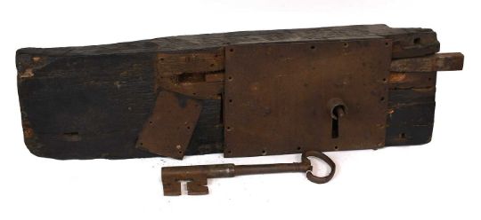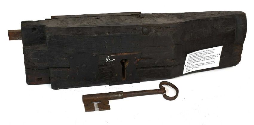 A 17th Century Oak-Cased Lock, with original key, the case crudely hewn and adzed