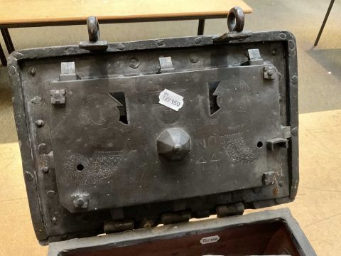 A 17th Century German Chest of Armada Type, with strapped wrought iron body, the hinged lid enclosing an engraved lock plate numbered 44 concealing an intricate locking system, with key