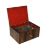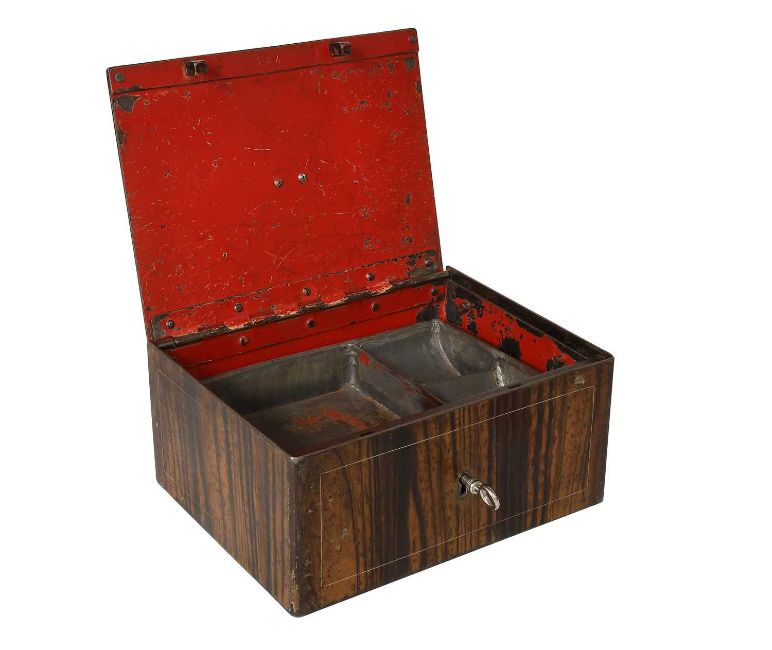 A Metal Portable Cash Box with Alarm, painted to simulate wood, the hinged lid enclosing a red-painted interior and removable metal tray